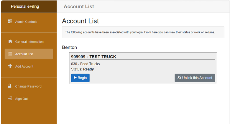 B. All of your linked business accounts will display in this list. Click the blue “Begin” button for the account you would like to start processing. (You will be able to save and go back if you do not have time to complete the return in one session.)