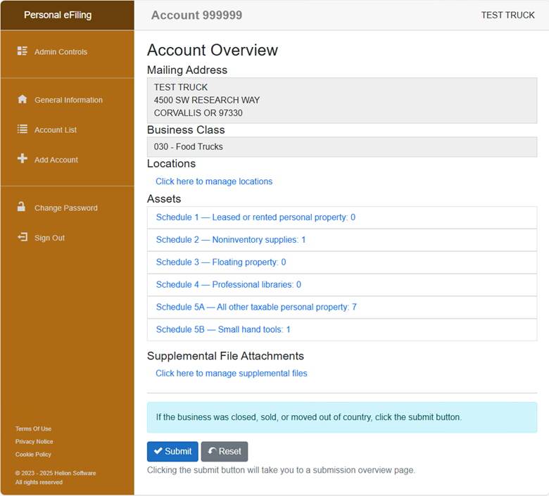 A. Once you click the “Begin” button you will be taken to your account overview page where you can verify the mailing address, navigate to different locations, and asset lists.