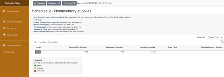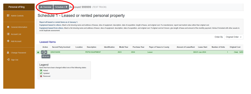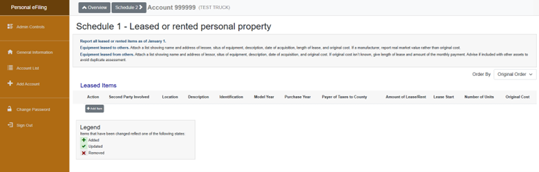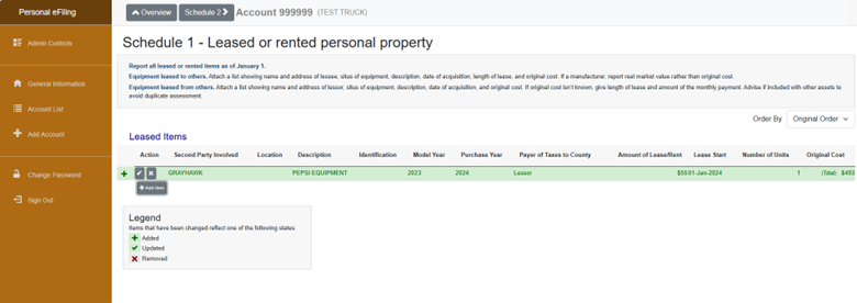 A. Schedule 1 -Leased Assets landing page is where you can verify the assets that are currently on file or to add a new leased or rented asset. Click the gray “Add Item” button to add a new leased asset or click the pencil icon to update an existing leased asset.