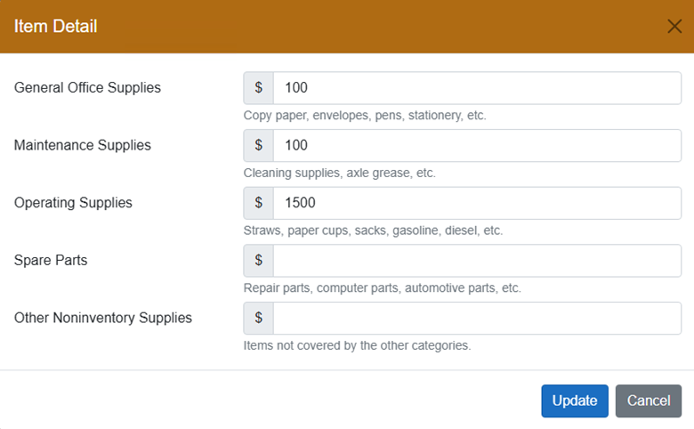 Non-Inventory supplies is not the lump sum of all of your assets these are other supplies used to run your business (ie: paper, pens, supplies that are replaced when used) Fill in each category as it applies. This is an estimated value of what you had on hand January 1st at 1 a.m.